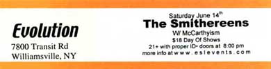 The Smithereens put on a powerful performance at the Evolution in Williamsville, New York, on Saturday, June 14, 2003. Enthusiastic fans of The Smithereens crowded the stage area and an adjacent bar. Catching The Smithereens up close on an intimate stage is highly recommended to concertphiles.