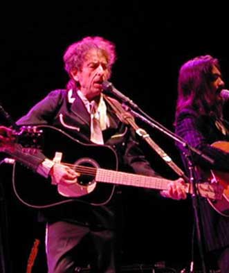 In a solid rock'n'roll show that needed no special effects, no gimmicks to be entertaining, Dylan reminded the 17,000+ arena crowd why he is the first rock musician to receive Kennedy Center honors. He played a substantial two hour, 22-song set with numbers ranging from "Blowin' in the Wind", from his protest singer days, to "Mississippi" from his latest release, Love and Theft. From the moment the band took the stage at 7:54 p.m. to the tune of the Bonanza theme (Dylan needs no opening act to get the crowd in the mood), the "Greatest Band in the Land" had the crowd enraptured, hanging onto every note.