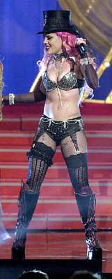 Squeals erupted when her silhouette appeared upon a large curtain. Appearing after an instrumental interlude, P!NK launched straight into her hot single "Get The Party Started", rocking the Tower to the hilt. She used a mini-megaphone to alter her voice during a vocal passage. A cool graffiti mural displaying her name P!NK was utilized to project an urban atmosphere.