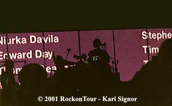 As the evening came to a close, U2 rolled into a live-favorite, "One". Just as in other moments throughout the evening, separate television screens, stretching the length of the stage behind Larry and his drums, rose up from behind the stage. This time, though, the screens were not flashing bright imagery; instead they projected names. Behind the band scrolled the names of every crew-member and passenger of the four airline flights of September 11th, as well as the names of all those lost from the New York Police and Fire Departments.