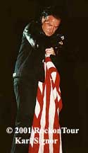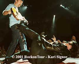The band satisfied the crowd with two encores. During "Bullet the Blue Sky", Bono armed himself with a spotlight, shooting the crowd with bursts of light as he strolled around the stage. As a gesture to our nation and the events of September 11, he flashed the lining of this black leather jacket which bore the pattern of the American flag. Perhaps his most gracious moment was when he stood directly in front of us, knelt down, and with outstretched arms grabbed an American flag from the fan next to me on my right.